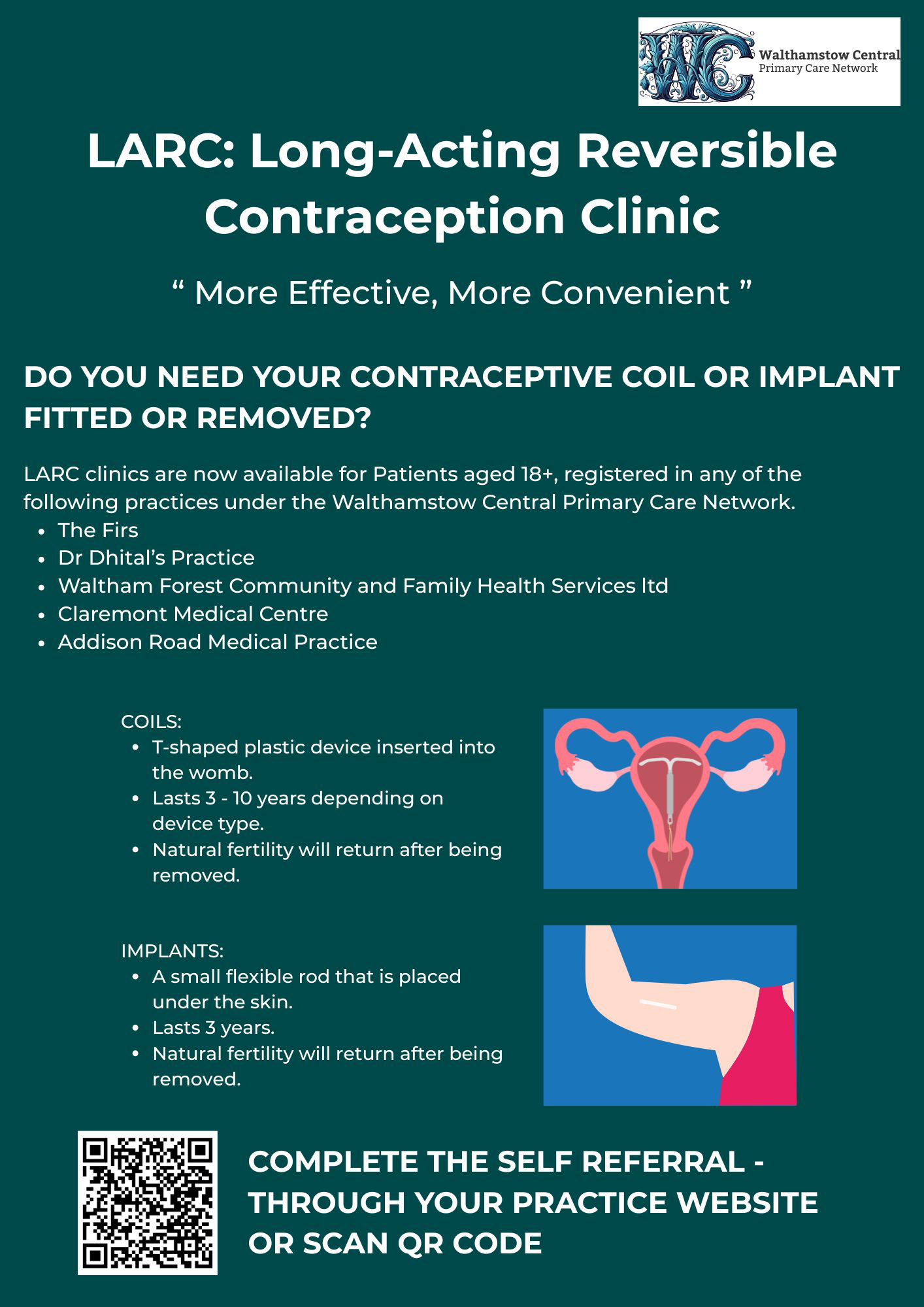 Long-Acting Reversible Contraception (LARC) clinics are now open to patients aged 18 and over who are registered with a Walthamstow Central Primary Care Network practices. Click here to learn more and to book an appointment.